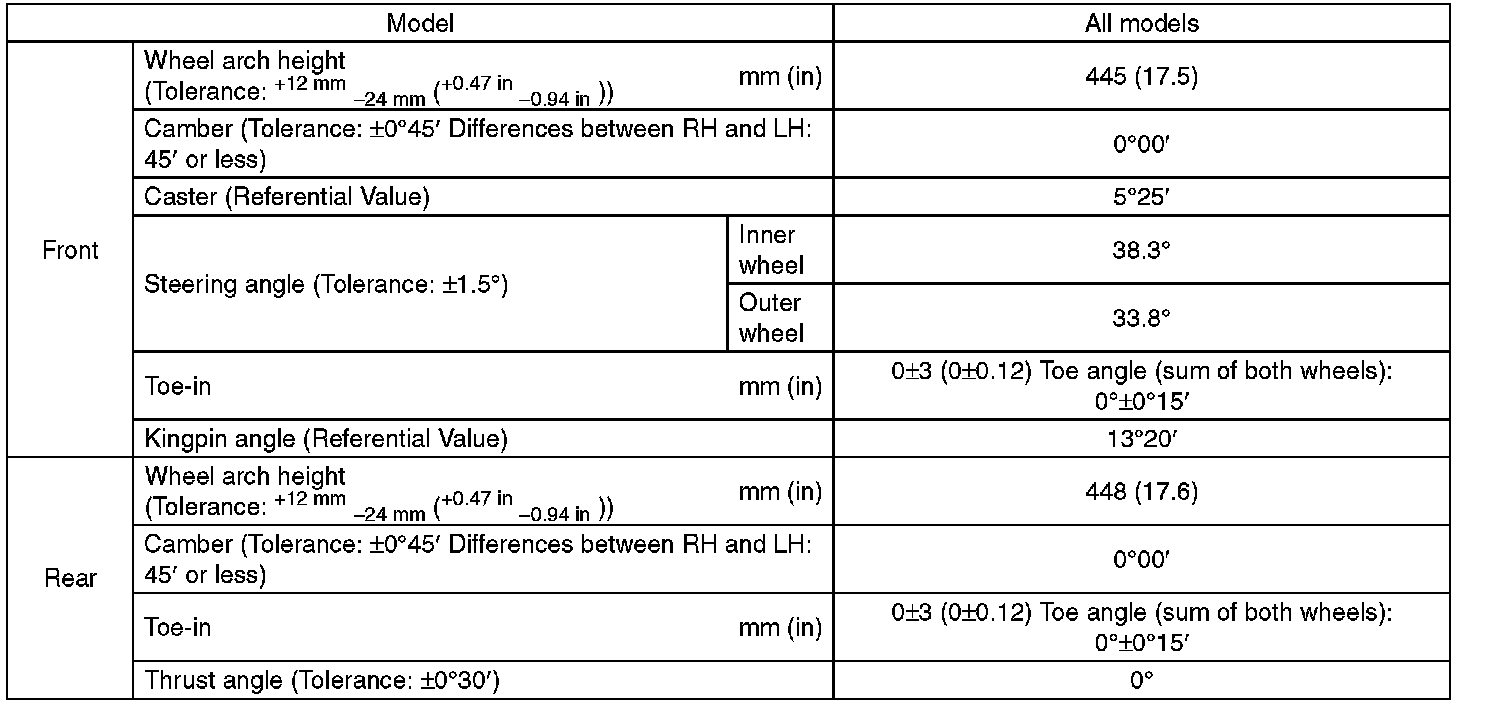 - Other items indicated in the specifications is not equipped with adjustment mechanisms. If other items exceed specifications, check the suspension parts and connections for deformation. If defective, replace with new parts.