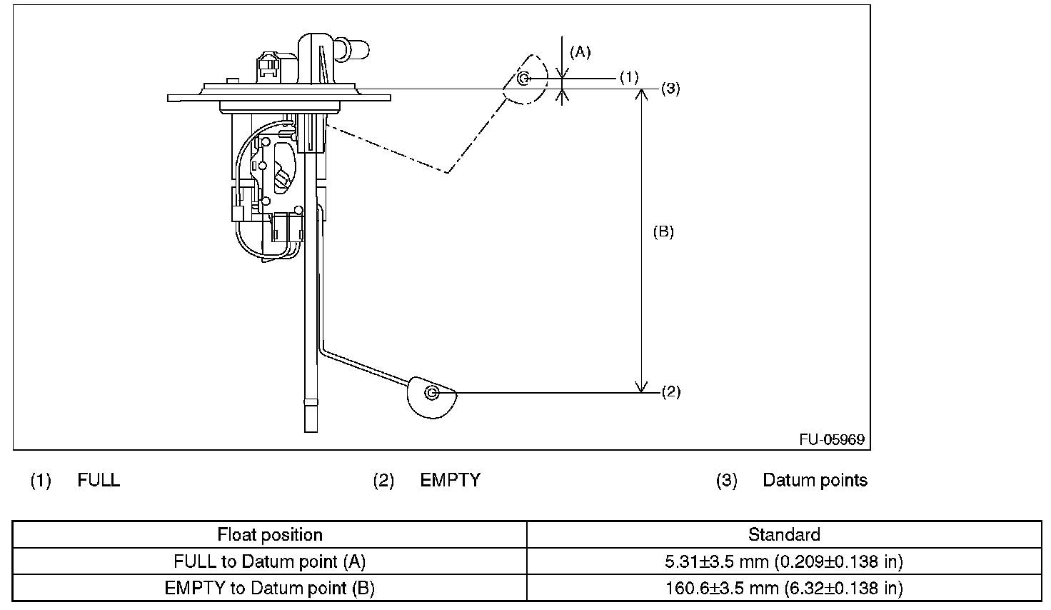 Measure the fuel sub level sensor float position.