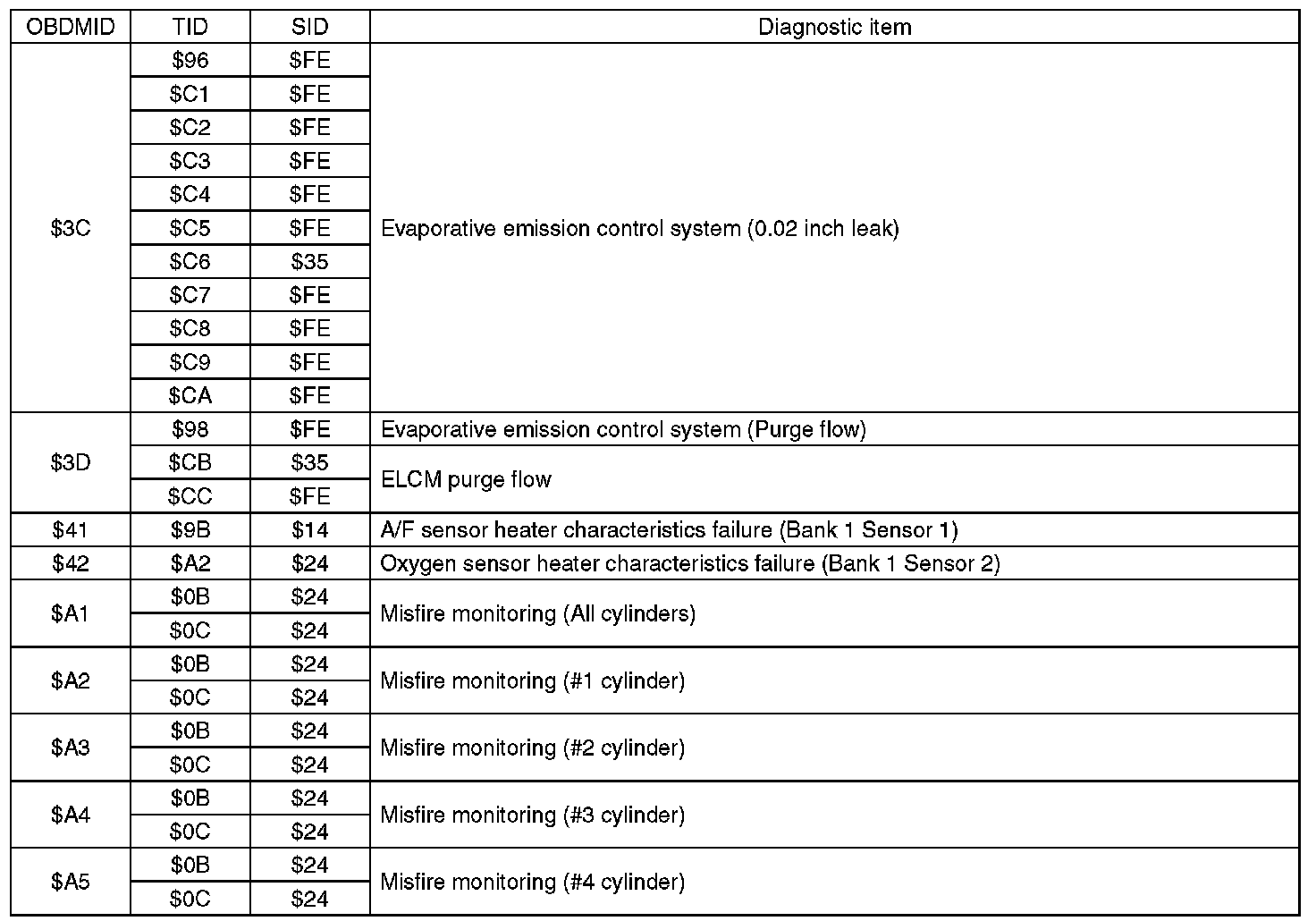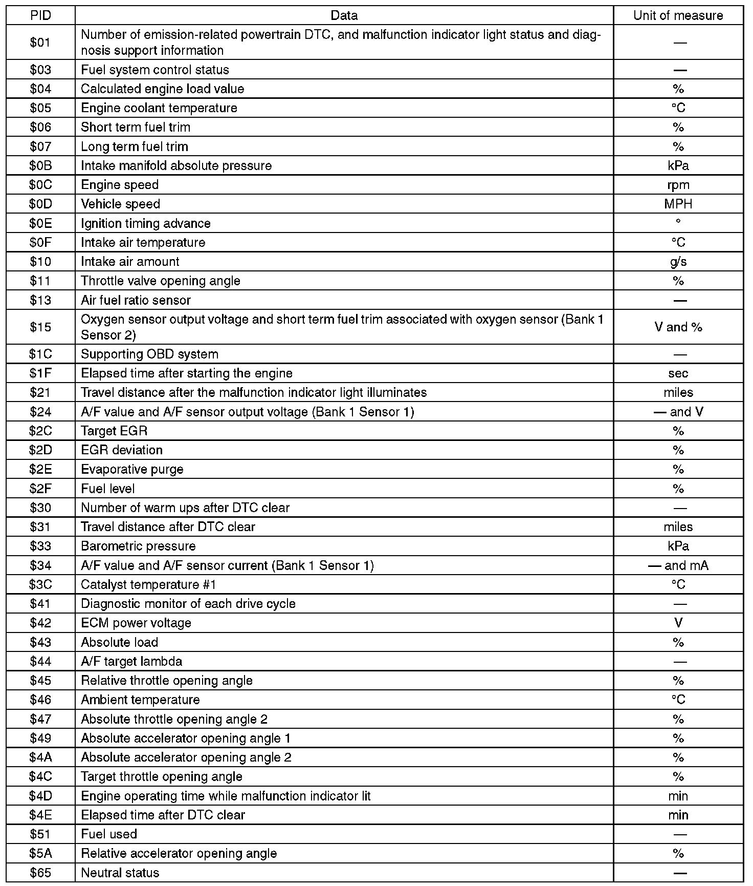 A list of the support data and PID (Parameter Identification) codes are shown in the following table.