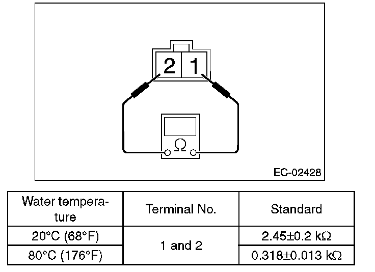 3. Raise water temperature gradually, measure the resistance between the engine coolant temperature sensor terminals when the temperature is 20 °C (68 °F) and 80 °C (176 °F).