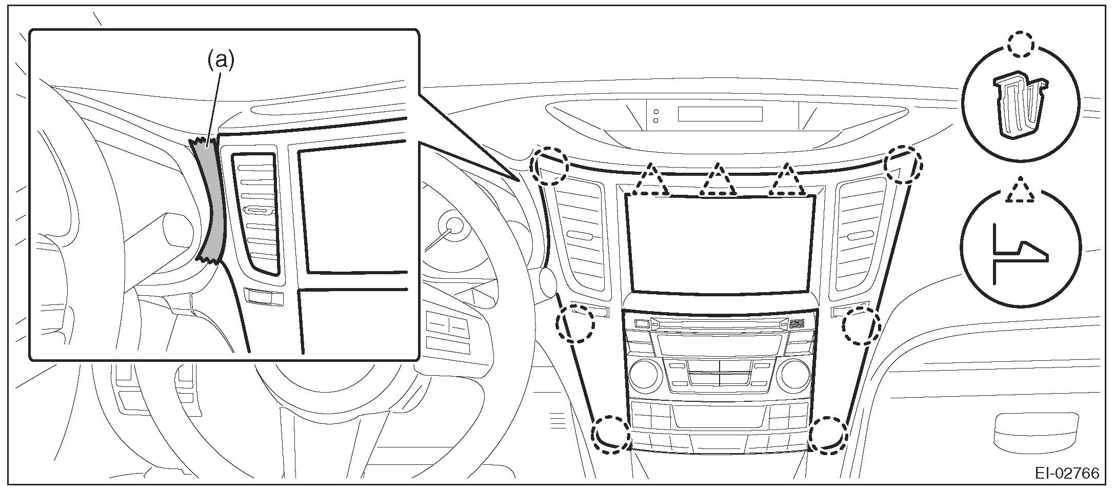 2. Insert a finger into the air vent grille and release the left and right clips at the top of the center panel. (A), (B)