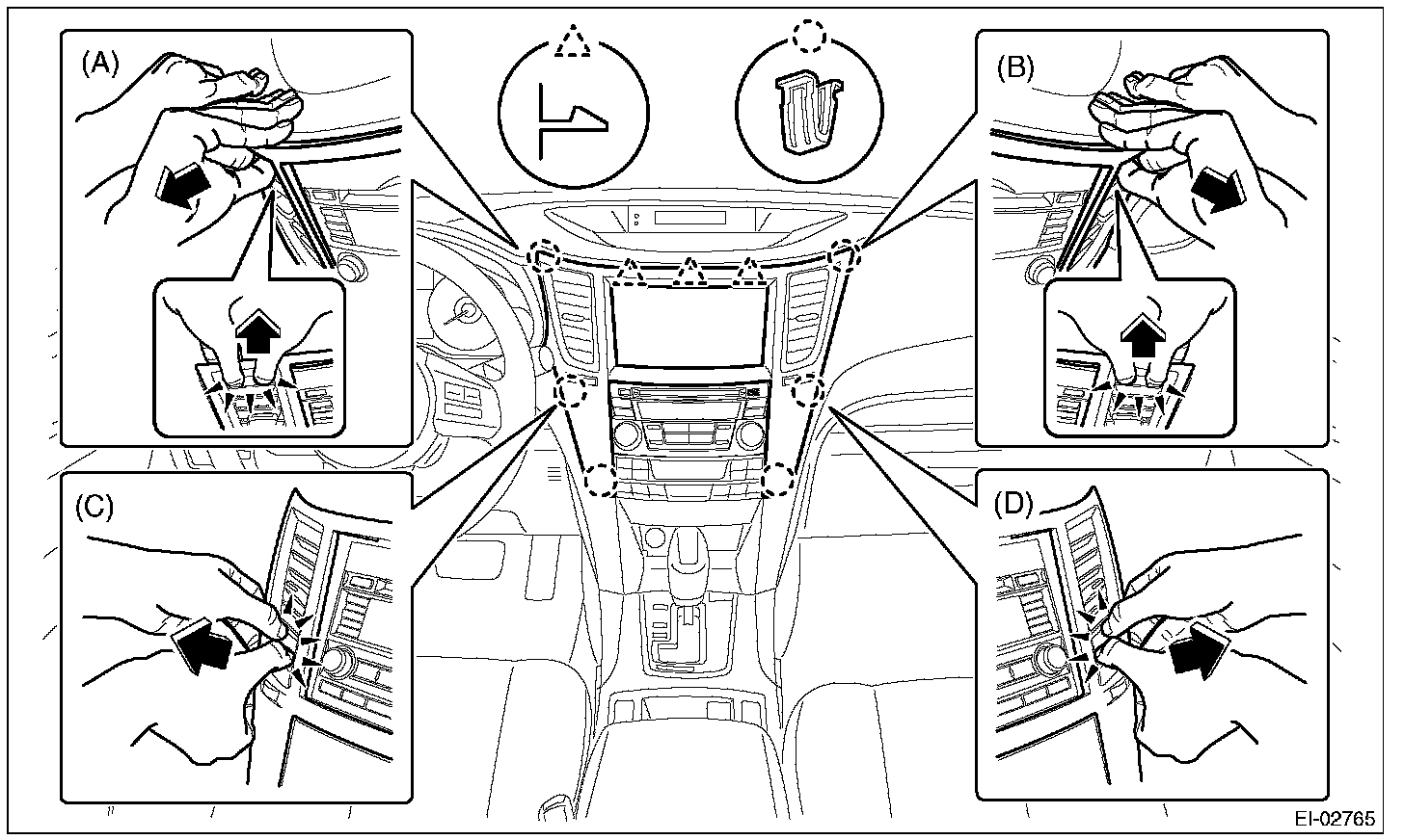 3. Insert a finger into the air vent grille and release the left and right clips at the center of the center panel. (C), (D)