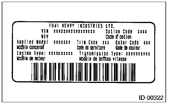 The model number plate indicates: the applied model, the option code, the trim code, the engine type, the transmission type, and the exterior color code. This information is helpful when placing orders for parts.