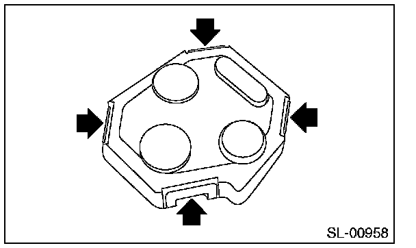 CAUTION: To prevent static electricity damage to the keyless transmitter printed circuit board, touch the steel area of building with hand to discharge static electricity carried on body or clothes before disassembling the keyless transmitter.