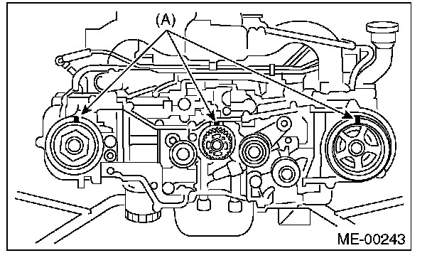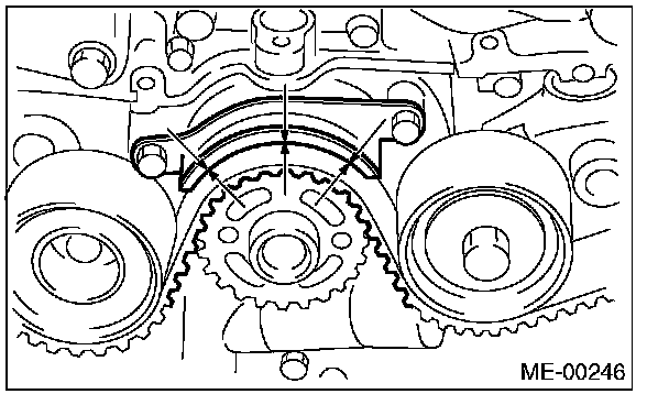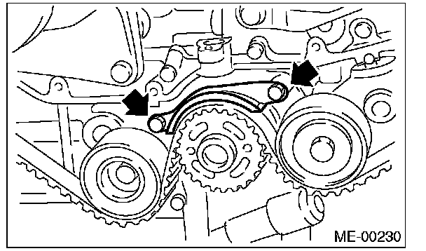 (2) Using white paint, put an alignment mark or an arrow mark on timing belts in relation to the crank sprocket and cam sprockets.