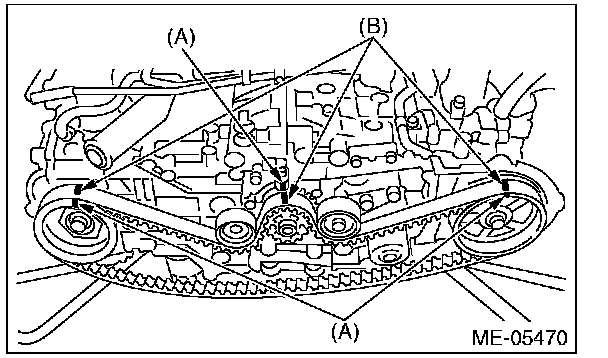 4) While aligning the alignment mark (B) on timing belt with the mark (A) on sprockets, position the timing belt properly.