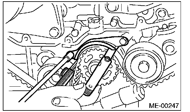 7) After ensuring the marks on timing belt and camshaft sprockets are aligned, remove the stopper pin from belt tension adjuster.