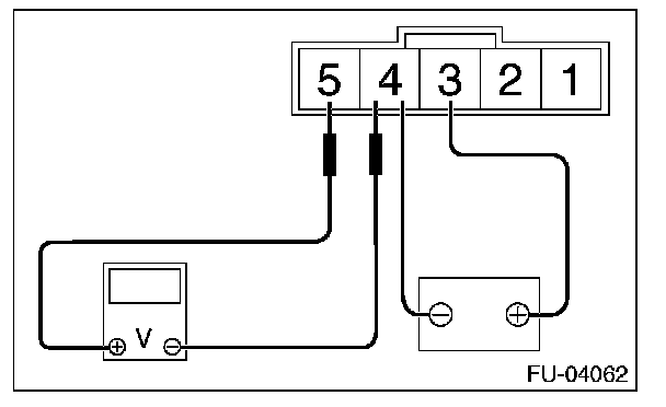 1. Connect the battery positive terminal to terminal No. 3 and the battery ground terminal to terminal No. 4, the circuit tester positive terminal to terminal No. 5 and the circuit tester ground terminal to terminal No. 4.
