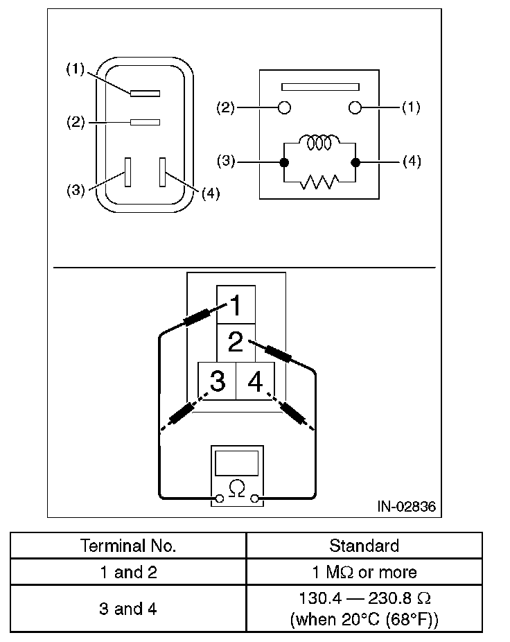 3. Connect battery positive terminal to terminal No. 3 and battery ground terminal to terminal No. 4, and measure the resistance between the main relay terminals.