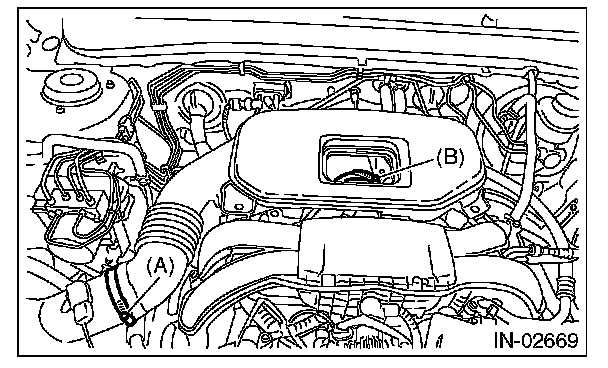 4. Loosen the clamp (B) which connects the air intake boot assembly and throttle body.
