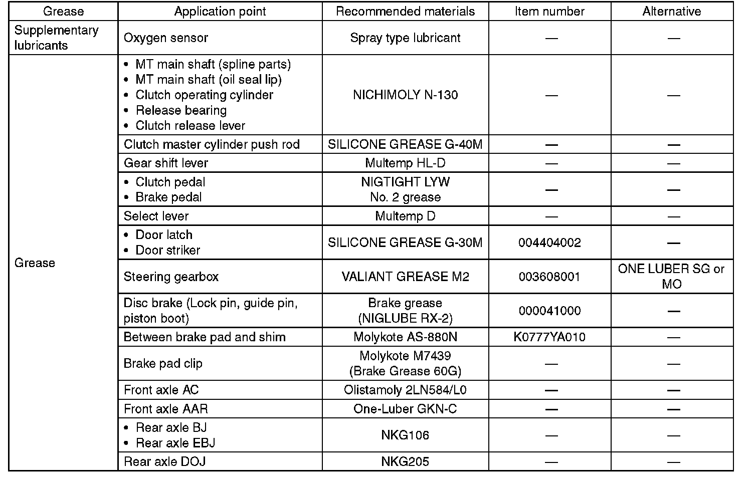 Use grease and supplementary lubricants shown in the table below.
