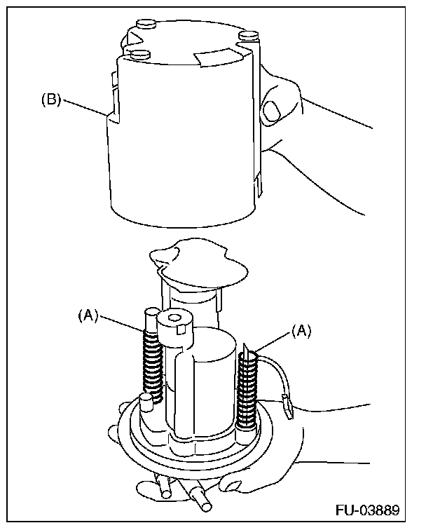 1. Assemble the gasket spacer (A) and support rubber cushion (B) to the fuel pump, and install the fuel pump to the fuel filter assembly.