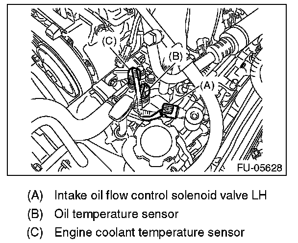 8. Disconnect the connectors of the oil temperature sensor, engine coolant temperature sensor and intake oil flow control solenoid valve LH.