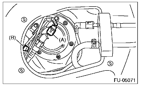 6. Disconnect the connector (A) from fuel sub level sensor, and remove the clip (B) securing the fuel cord from fuel sub level sensor protector.