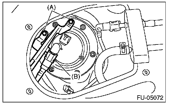 - Align protrusion (B) of the fuel sub level sensor to the cutout in the fuel sub level sensor upper plate.
