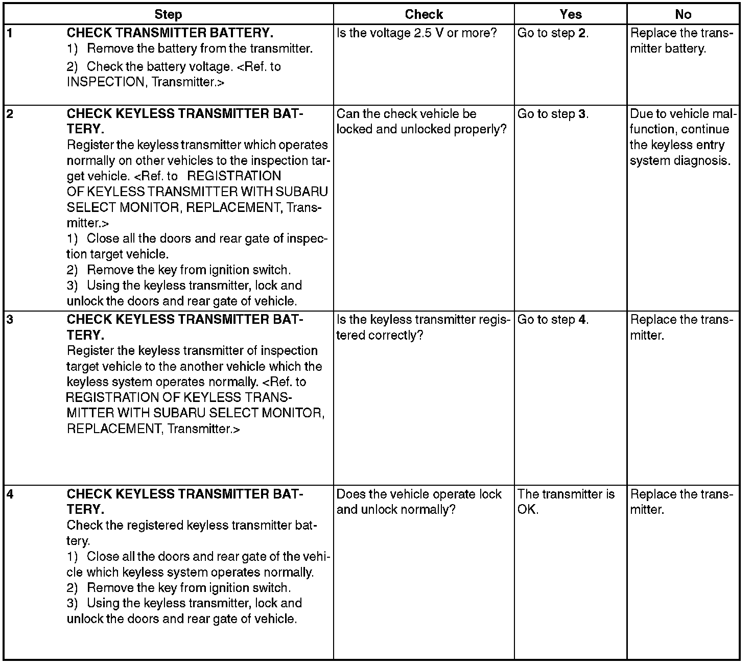 CAUTION: Be sure to reset the keyless transmitter of other vehicle which is registered to the inspection target vehicle, and the vehicle to which the keyless transmitter is registered for inspection, to the condition before performing the inspection. (Register the keyless transmitter again.)