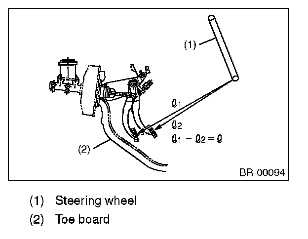 Run the engine at idle after warming up the engine, and depress the brake pedal with a force of 500 N (51 kgf, 112 lbf). Measure the distance between the brake pedal and steering wheel. Release the pedal, and measure the distance between pedal and steering wheel again.