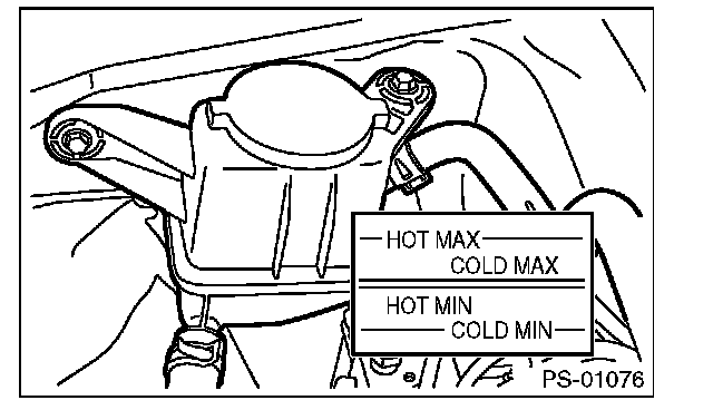 3) Inspect the fluid level of reservoir tank with vehicle on level surface and engine stopped.