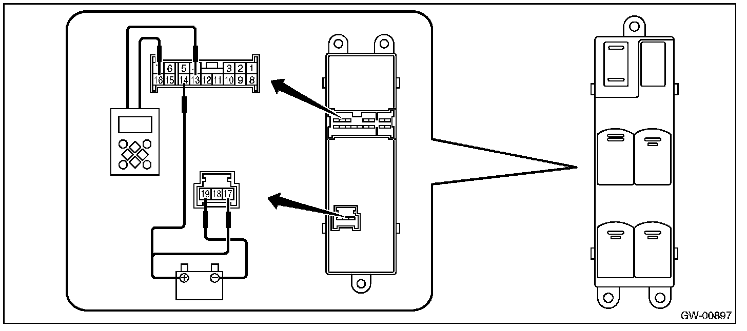 2. Connect the battery and the Subaru Select Monitor to the power window main switch terminal.