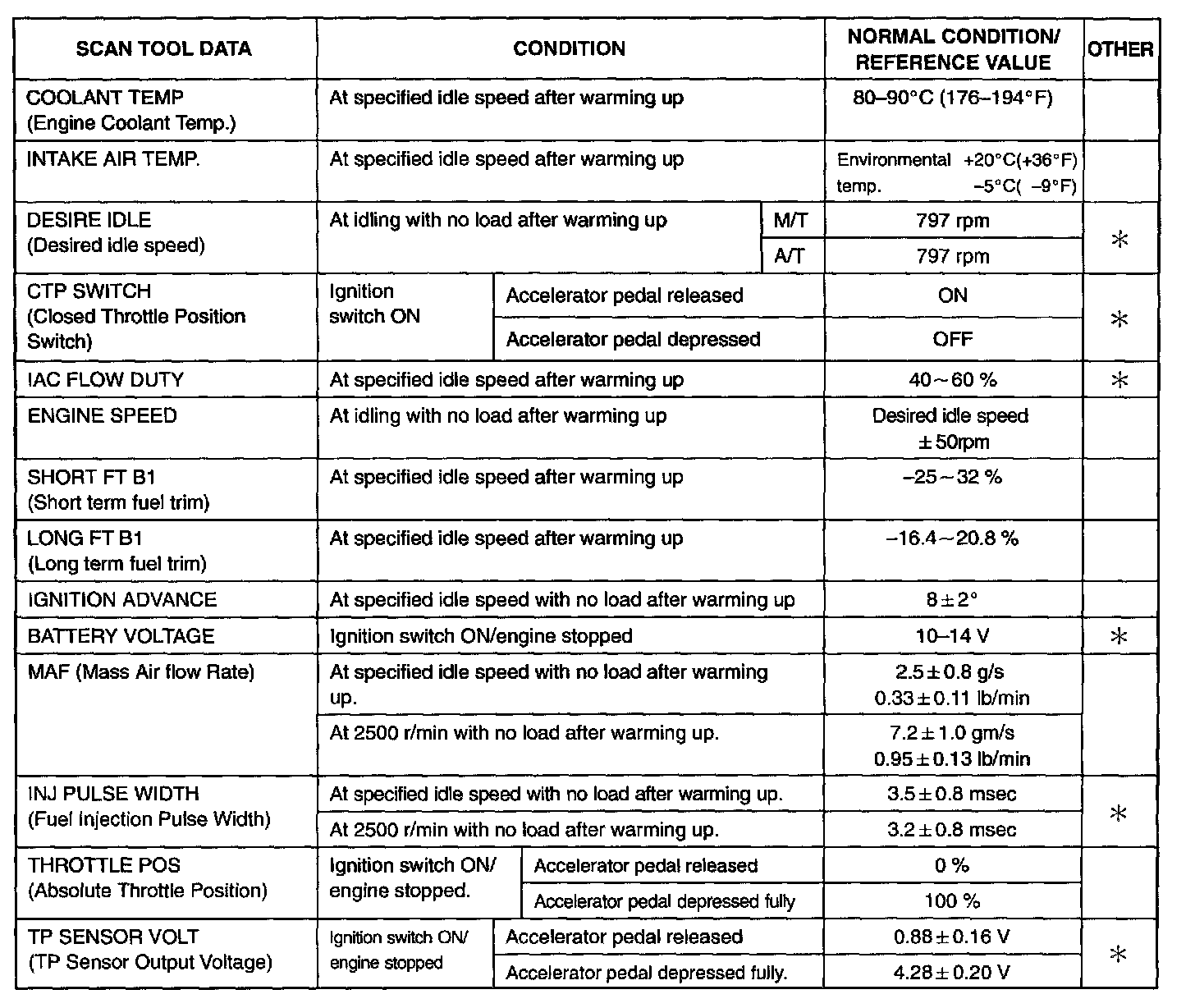 Also, conditions in the below table that can be checked by the scan tool are those detected by ECM and output from ECM as Commands and there may be cases where the engine or actuator is not operating (in the condition) as indicated by the scan tool. Be sure to use the timing light to check the ignition timing.