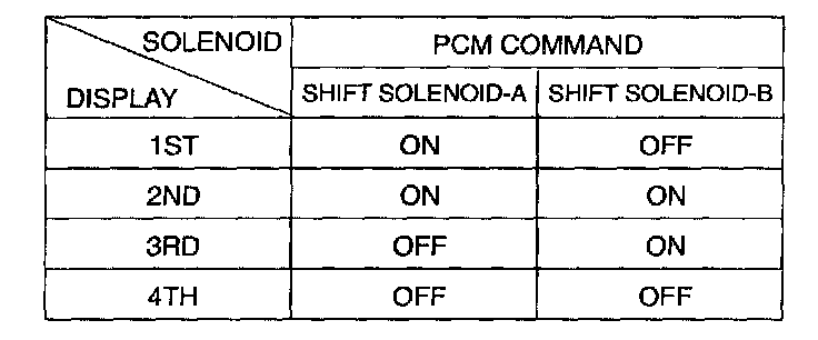 The gear position is determined on the basis of the command state signals generated from PCM (ECM) to shift solenoids A and B (#1 and #2) and displayed as shown in the table below.
