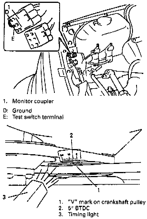 Connect "D" and "E" terminals of monitor coupler by using service wire so that ignition timing is fixed.