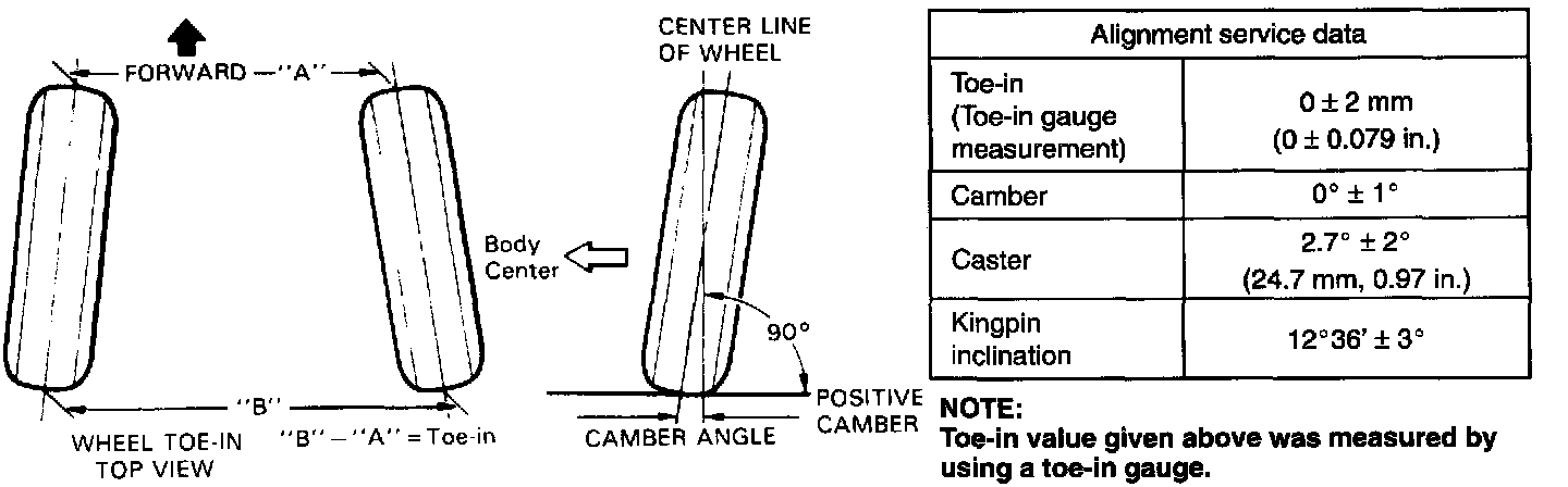 SPECIFICATIONFront alignment refers to the angular relationship between the front wheels, the front suspension attaching parts and the ground. Generally, the only adjustment required for front alignment is toe setting.