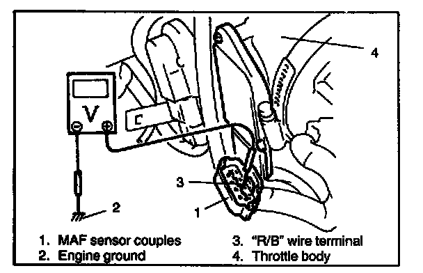 3. Connect voltmeter to "R/B" wire terminal of MAF sensor coupler disconnected and ground.