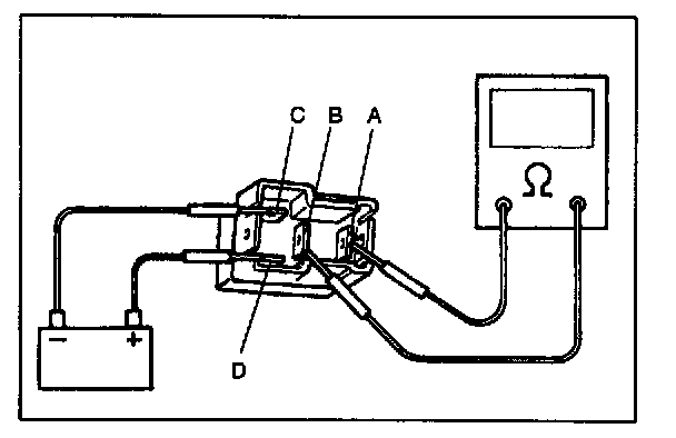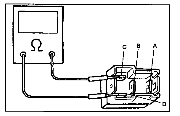 4. Check that there is continuity between terminals "A" and "B" when battery is connected to terminals "C" and "D".