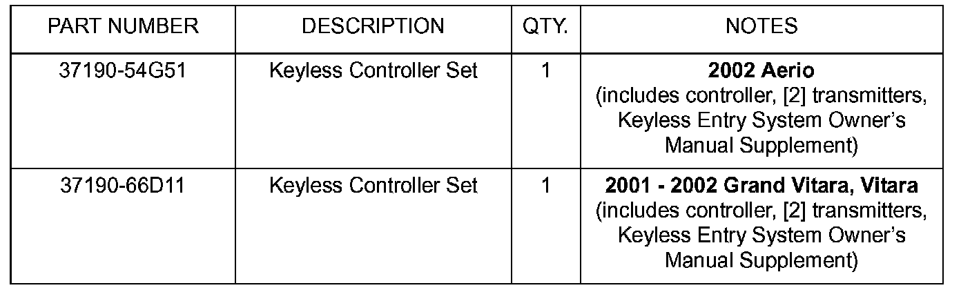 2001 - 2002 models: Use the applicable Service Manual to diagnose the concern. If diagnostics determine the transmitters(s) or controller need to be replaced, install a new programmable Keyless Controller Set. Then use the programming procedure located in the KEYLESS ENTRY SYSTEM OWNER'S MANUAL SUPPLEMENT