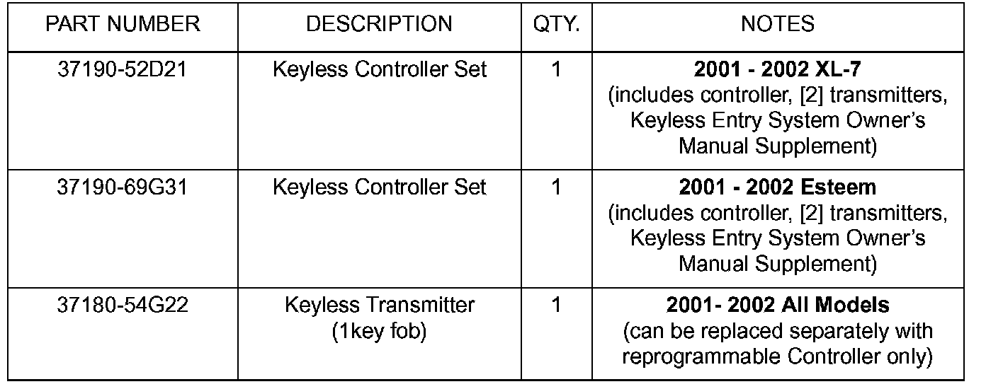 On these 2001-2002 models, perform the diagnostics located in the applicable Service Manual and if it states to replace the controller or transmitter(s), be sure to install the new programmable Keyless Controller Set. Then program up to four(4) transmitters to the controller using the Owner's Manual Supplement instructions which is packed with the controller set.