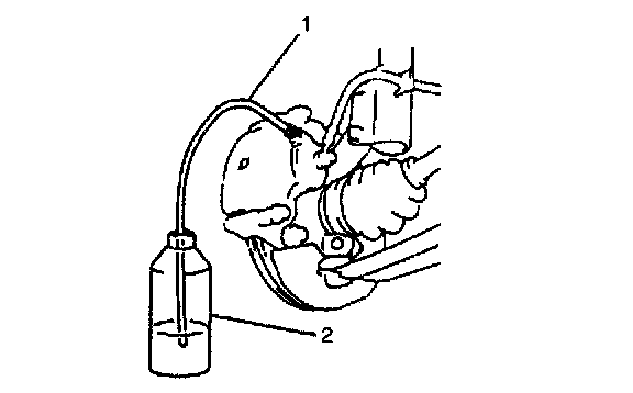 2. Remove bleeder plug cap. Attach a vinyl tube (1) to bleeder plug, and insert the other end into container (2).