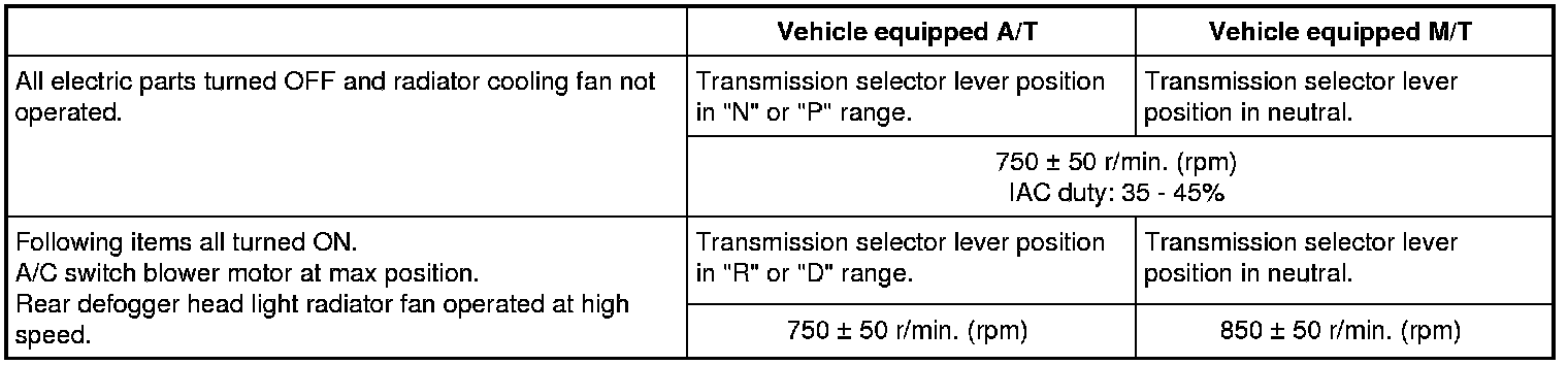 4) Check that specified engine idle speed is obtained with A/C ON if vehicle is equipped with A/C.