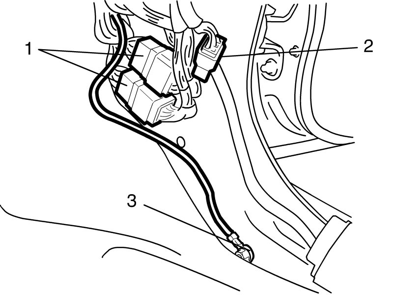 6) Disconnect instrument panel harness connectors clamp, engine harness connectors (1) and floor harness connector (2).