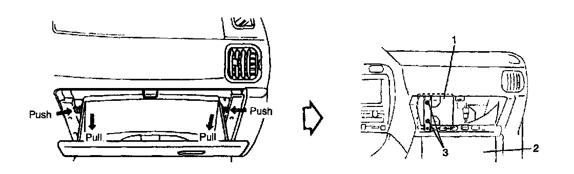 3. Open glove box (2), then while pressing glove box stopper, pull out glove box from instrument panel.