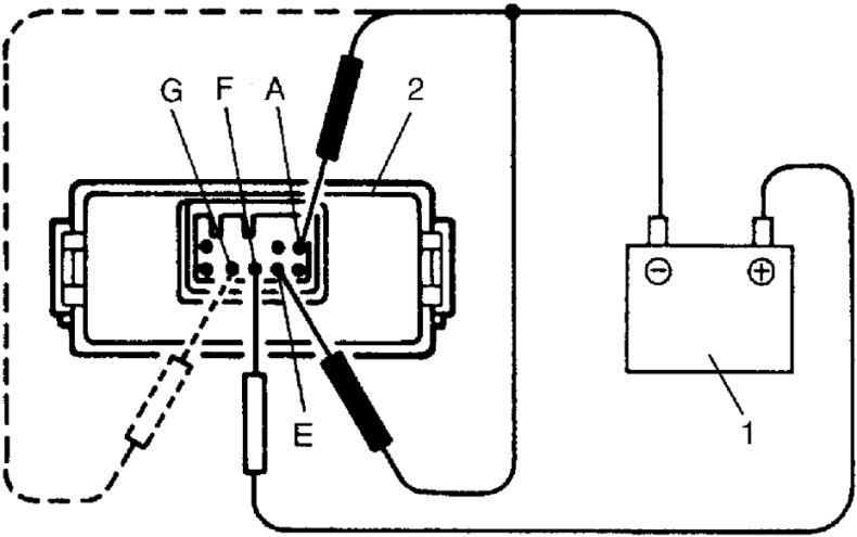 2. Connect (+) wire and (-) wire of 12 V battery (1) to terminal "A", "E" and "F" as shown in figure.
