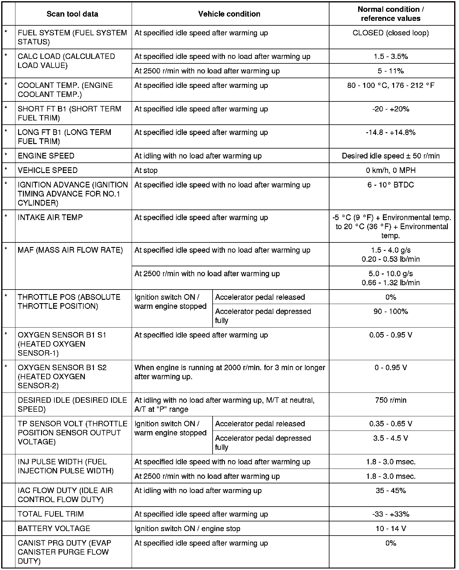 - With the OBD-II generic scan tool, only star (*) marked data in the following table can be read.