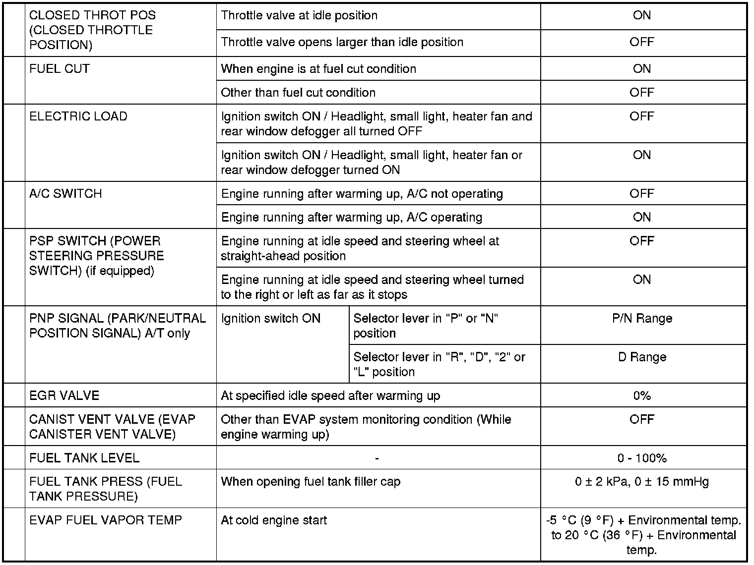 - When checking the data with the engine running at idle or racing, be sure to shift M/T gear to the neutral gear position and A/T gear to the "Park" position and pull the parking brake fully. Also, if nothing or "no load" is indicated, turn OFF A/C, all electric loads, P/S and all the other necessary switches.