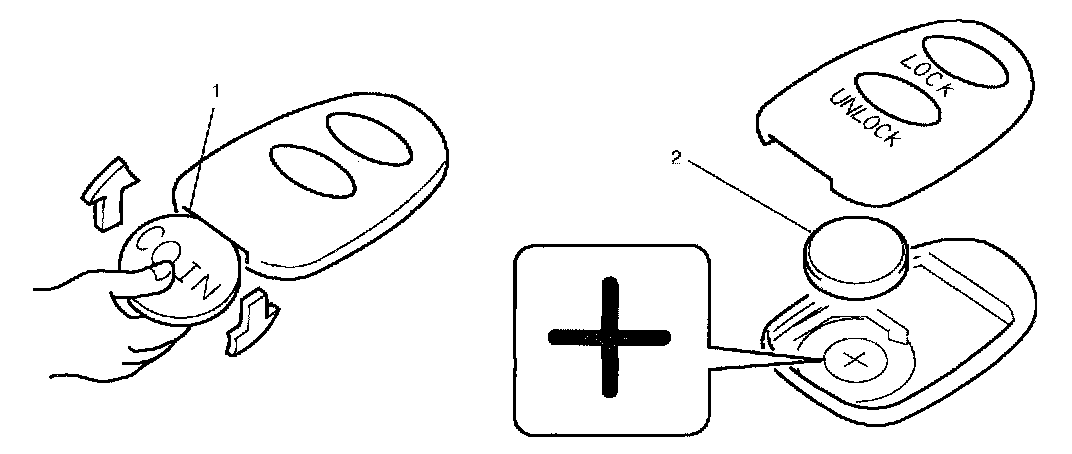 2. Replace the battery (lithium disc-type CR2032 or equivalent) (2) so its "+" terminal faces the "+" mark of the transmitter.
