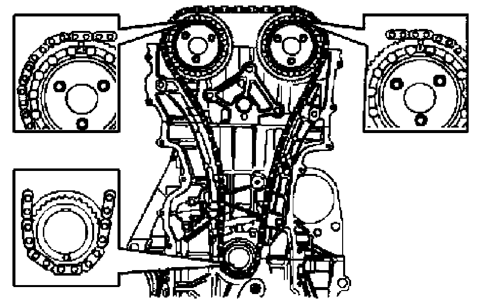 Make sure the three timing marks on the timing chain are exactly aligned with the marks on the exhaust camshaft sprocket, intake camshaft sprocket, and crankshaft sprocket respectively.