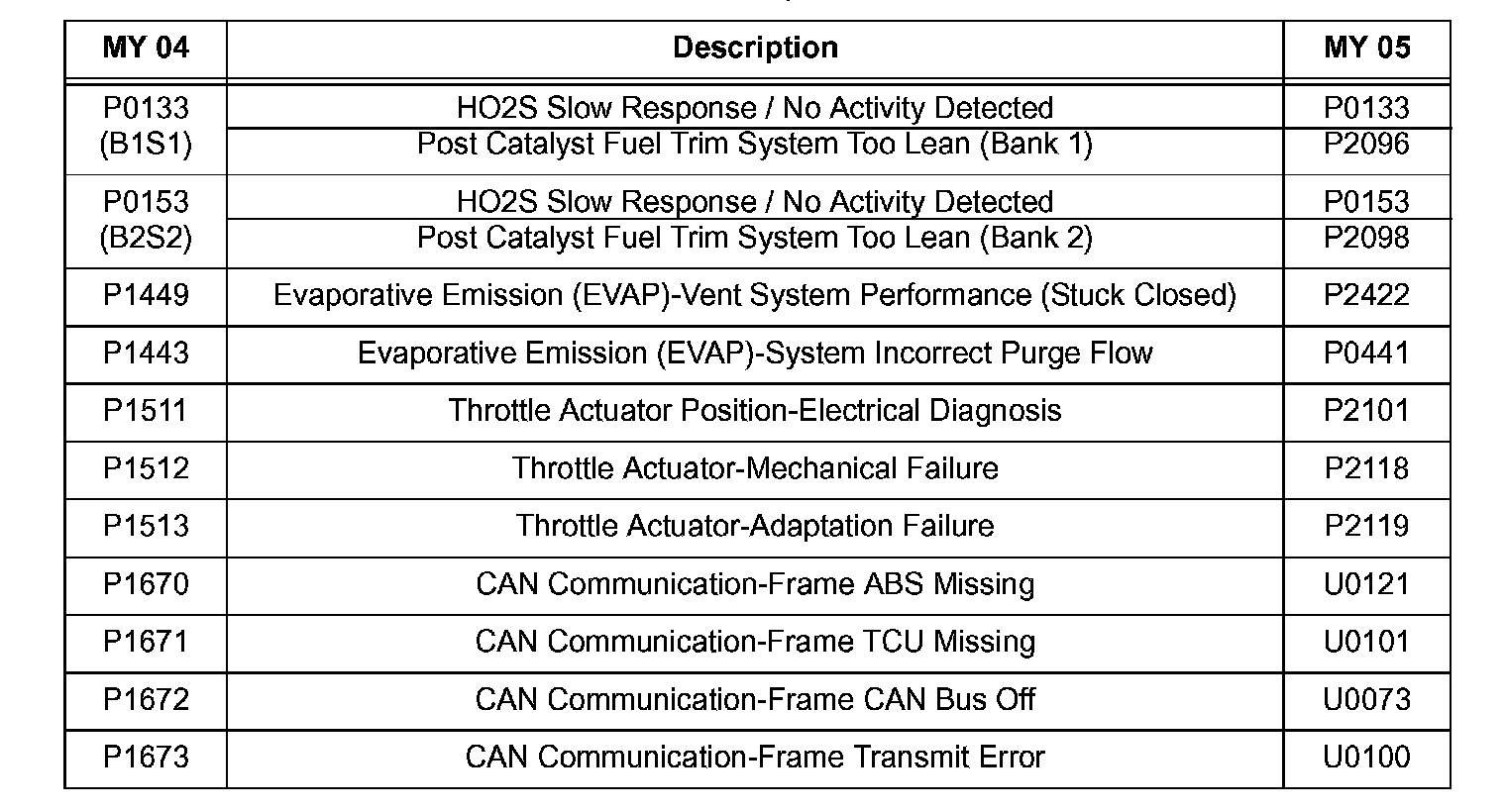 3. 04 MY vehicle may show DTCs which are related to the Os MY vehicles. See attached DTC list.