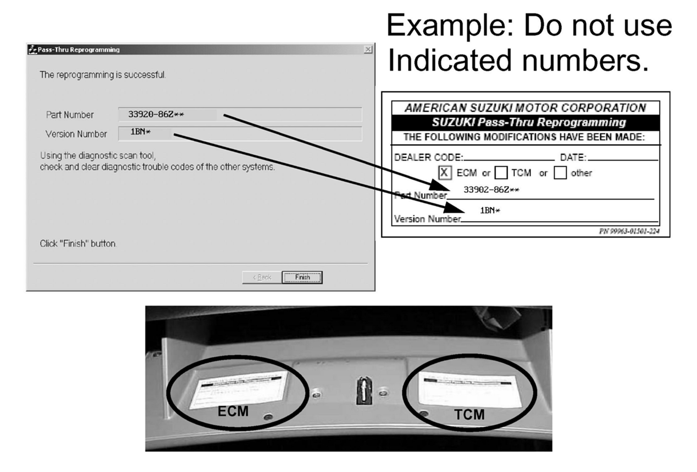 6. Fill out the Reprogram Label P/N 99963-01501-224 (the part number and version will be displayed at the "The reprogramming is successful" screen). Then affix the label to the back of the glove box door as pictured.