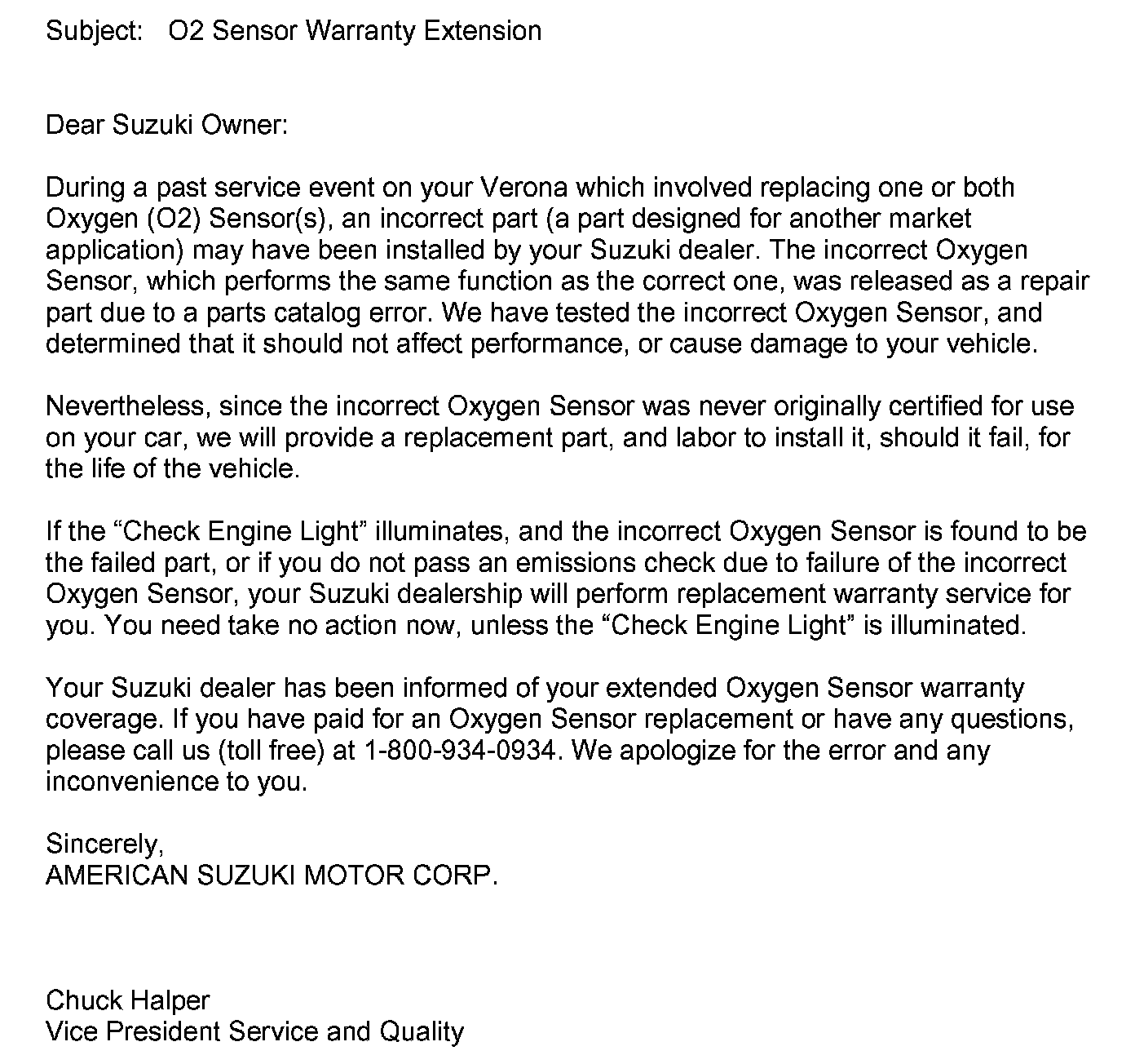 Home >> Suzuki >> 2004 >> Verona L6-2.5L >> Repair and Diagnosis >> Powertrain Management >> Computers and Control Systems >> Technical Service Bulletins >> Recalls >> Generals >> Campaign - O2 Sensor Replacement