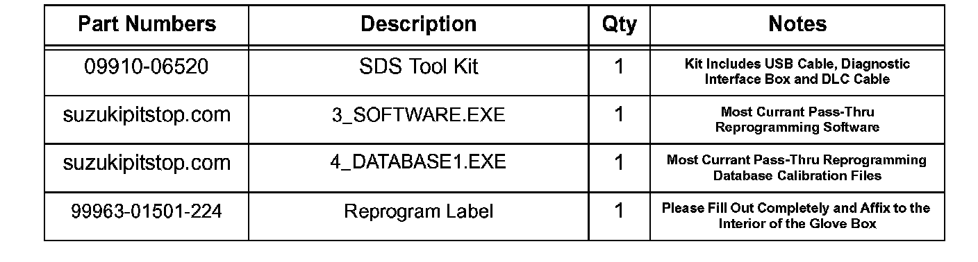 Updates will be completed by using a PC, the Suzuki Diagnostic System (SDS) Tool, applicable reprogramming software and database downloaded from Suzuki Pitstop.