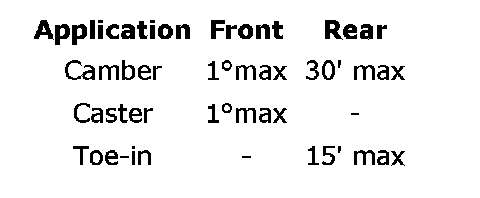 NOTE: The above alignment specifications are with the vehicle in a normally loaded condition. Prior to inspection or alignment, place a weight of approximately 150 lbs. (68 kg) on each front seat cushion.