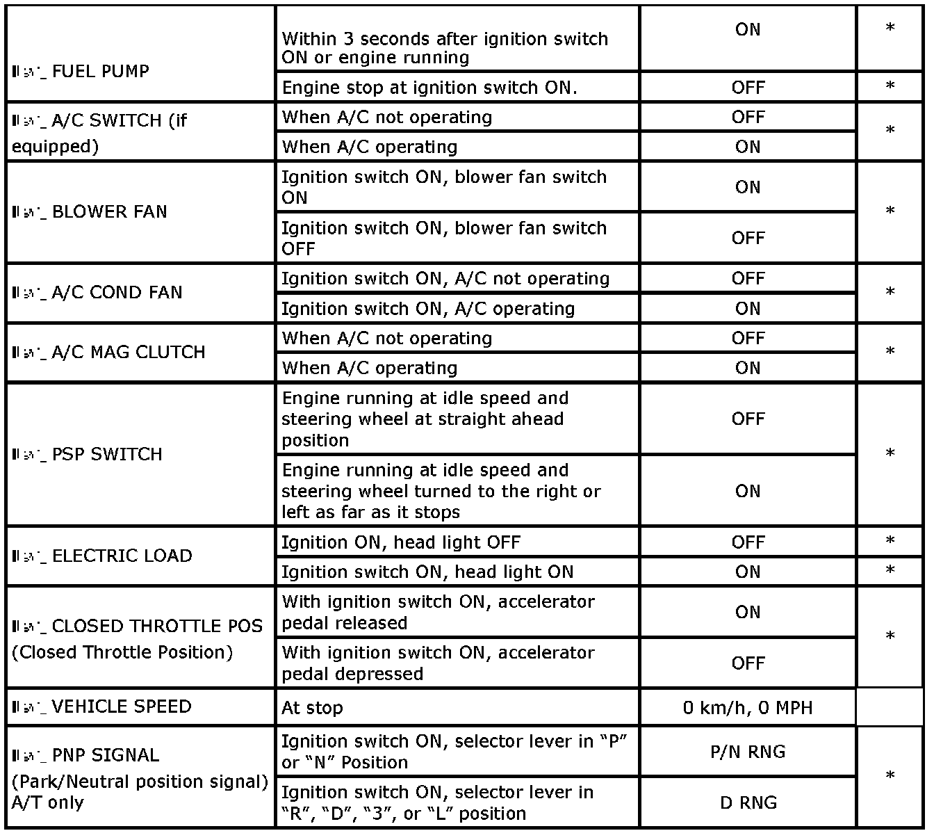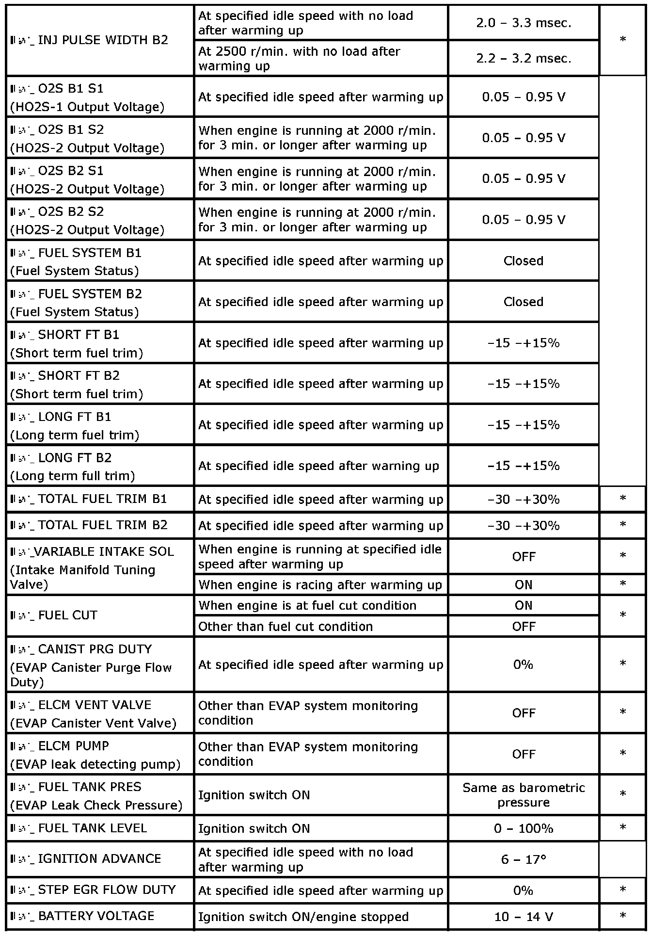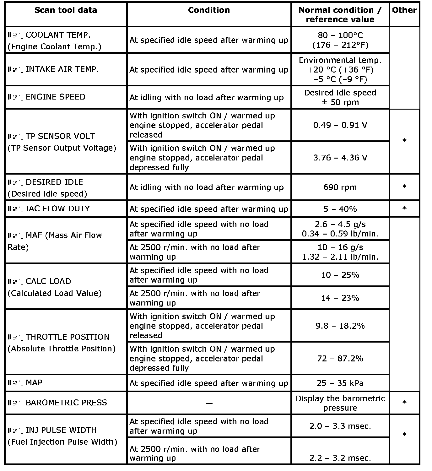 - Item with asterisk (*) in "Other" column can be read only by SUZUKI scan tool.