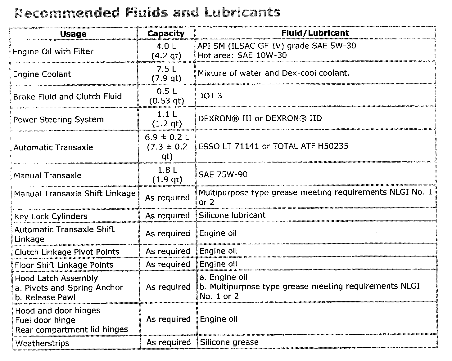 General Fluid Specifications