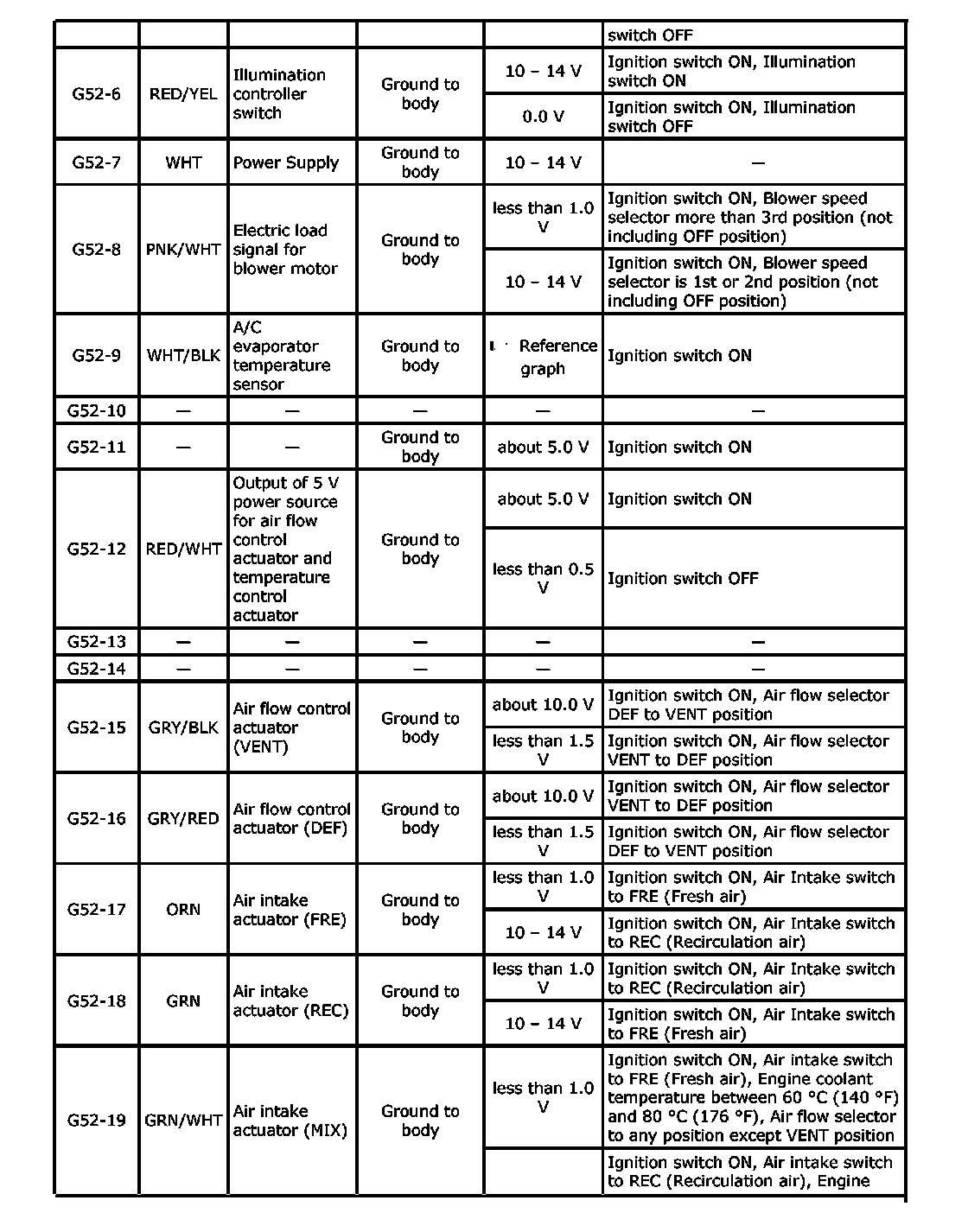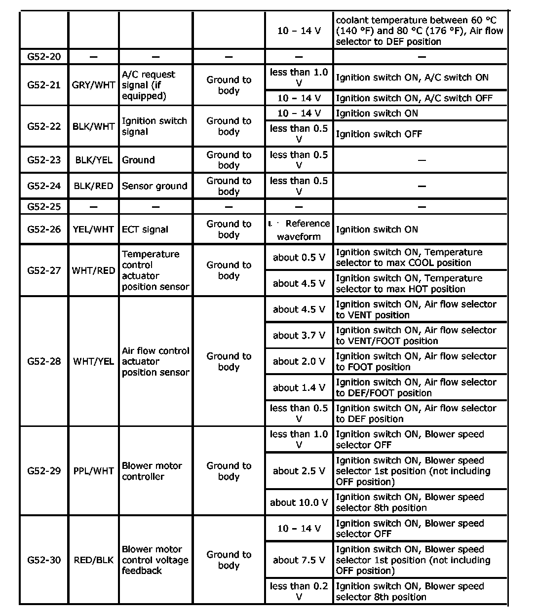 3. Check each terminal voltage with couplers connected by referring to HVAC Control Module Voltage Table.