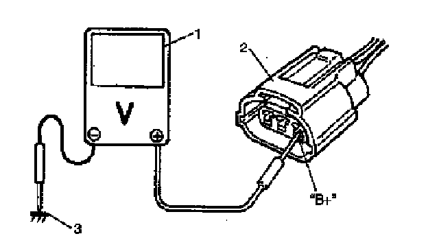 1. Connect voltmeter (1) to "B+" terminal of MAF sensor (2) coupler disconnected and ground (3)