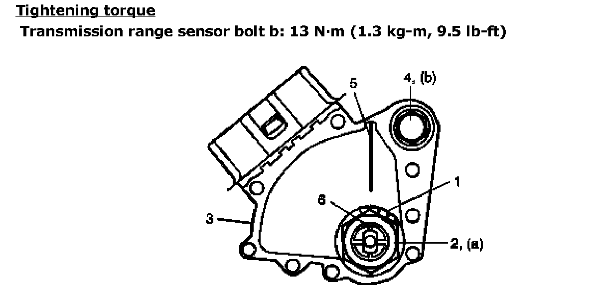4. With N reference line (5) on range sensor and shaft center (6) aligned, tighten transmission range sensor bolt (4) to specified torque.